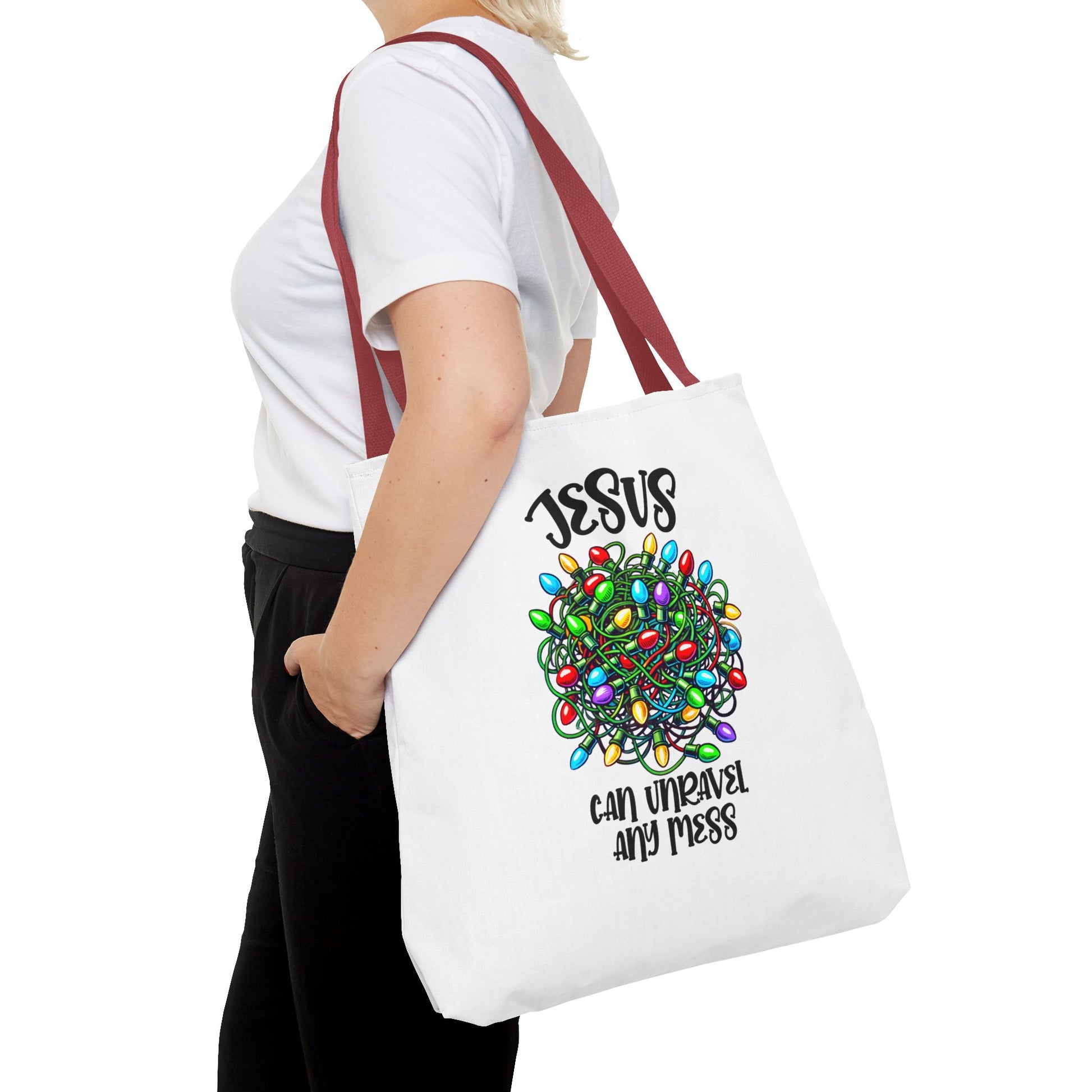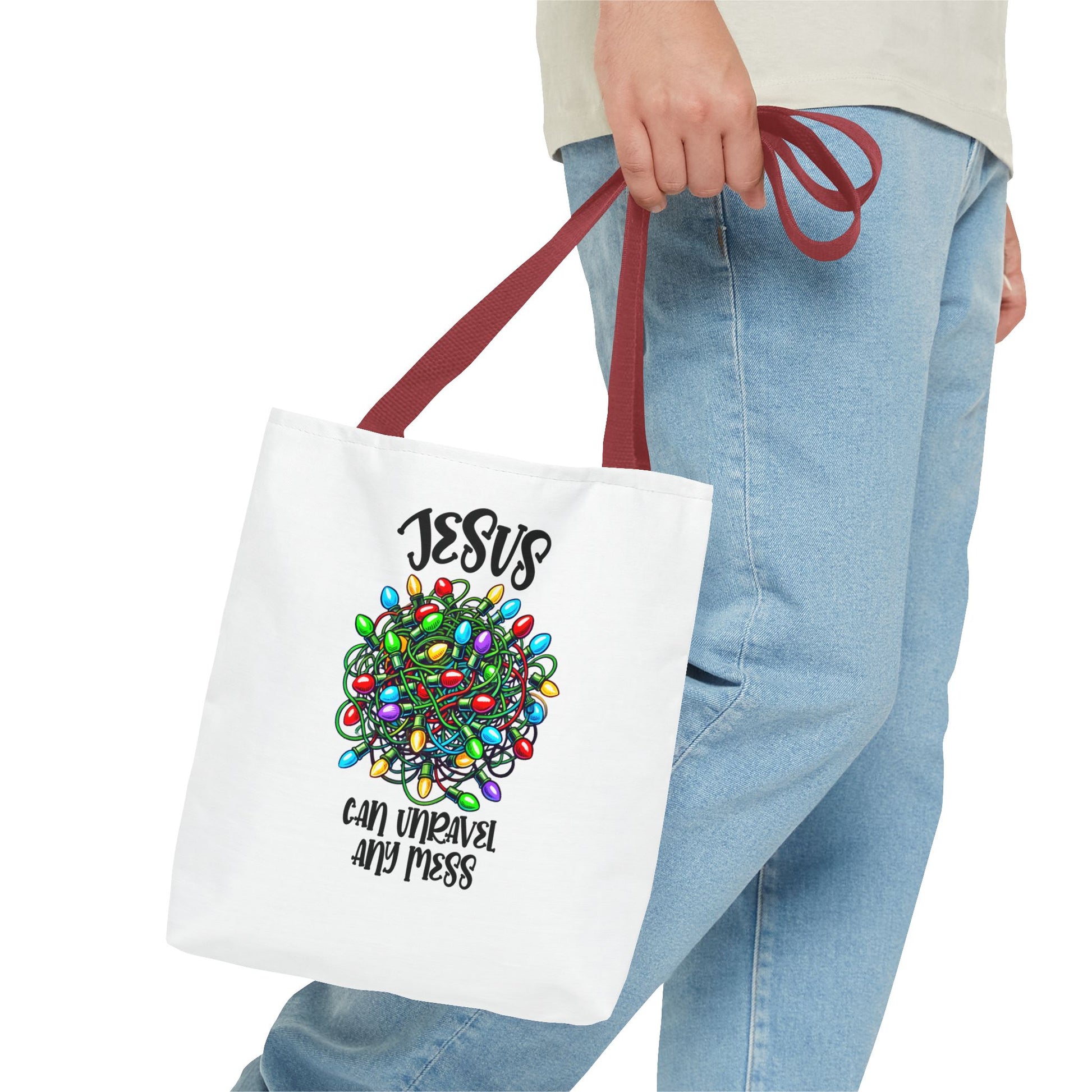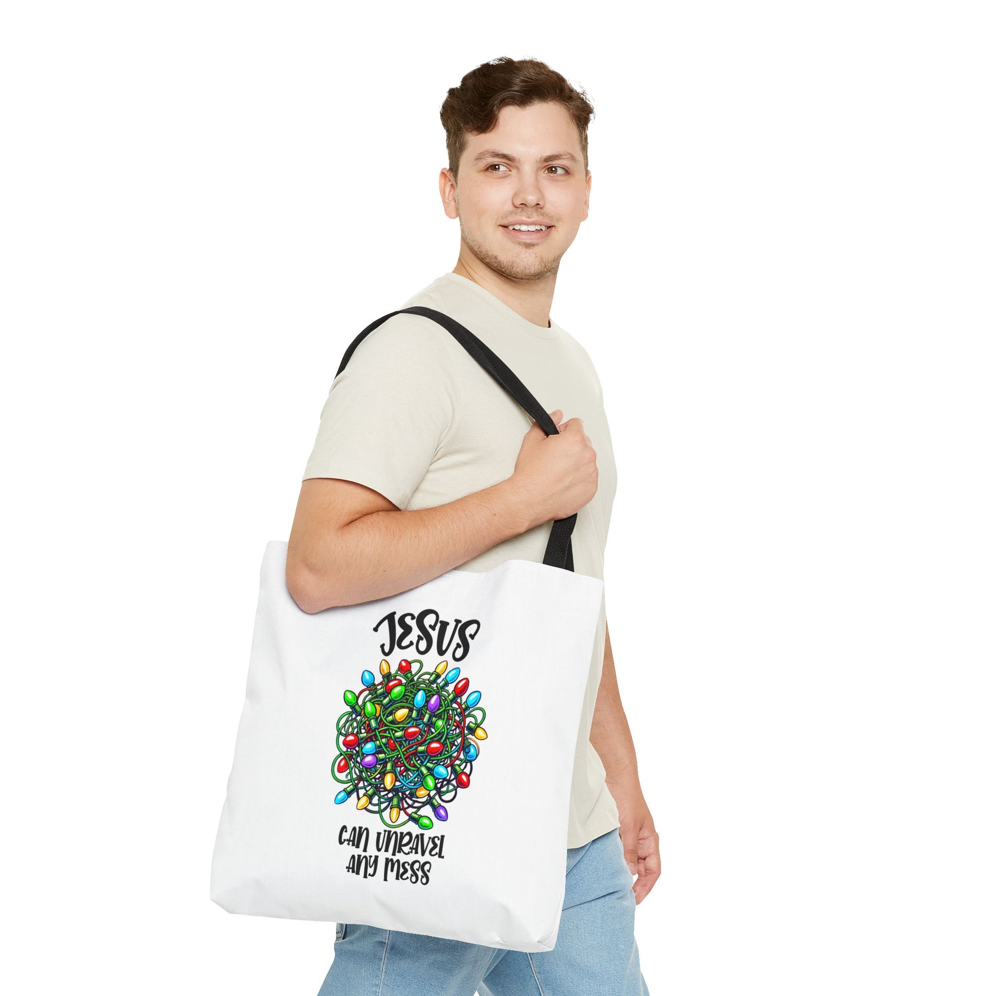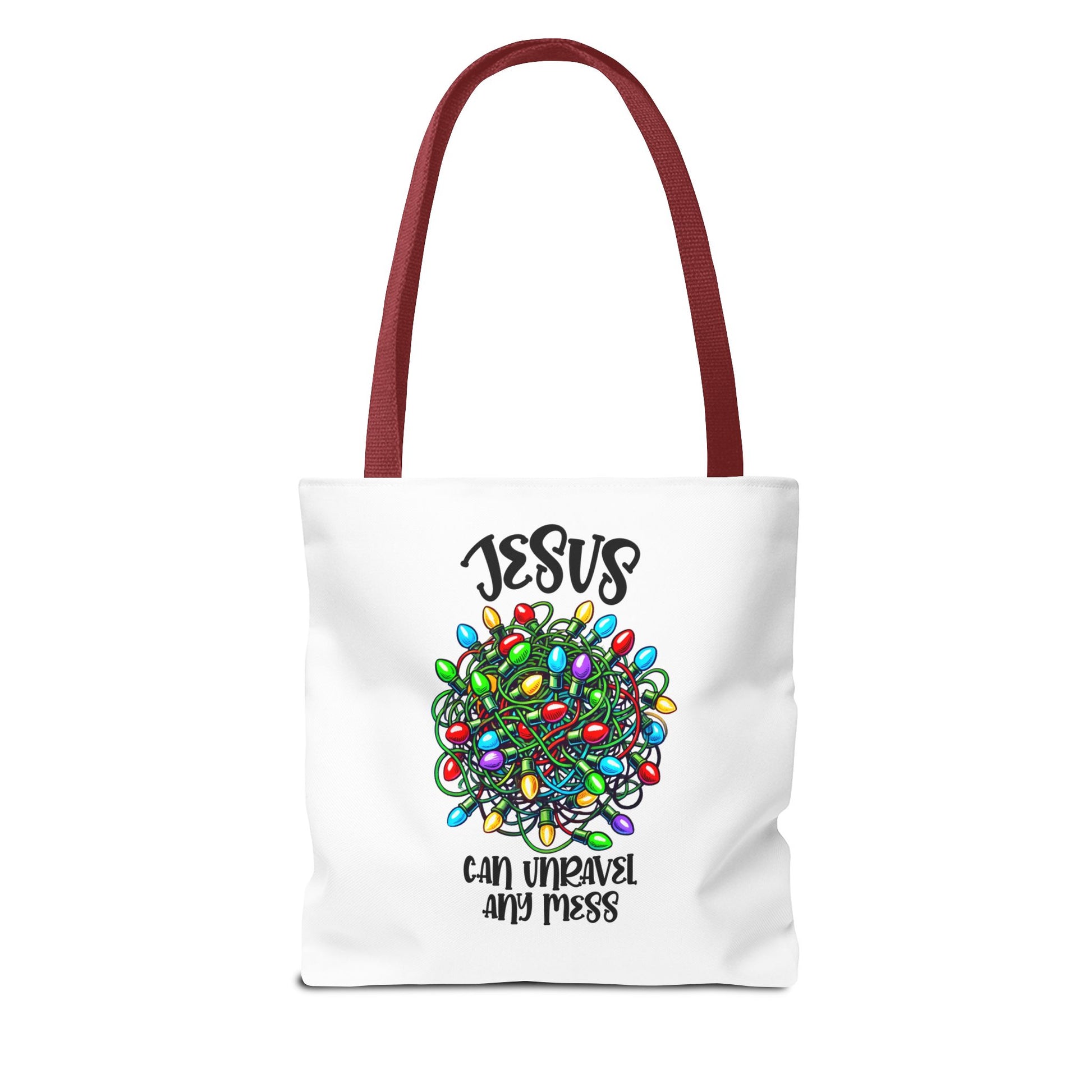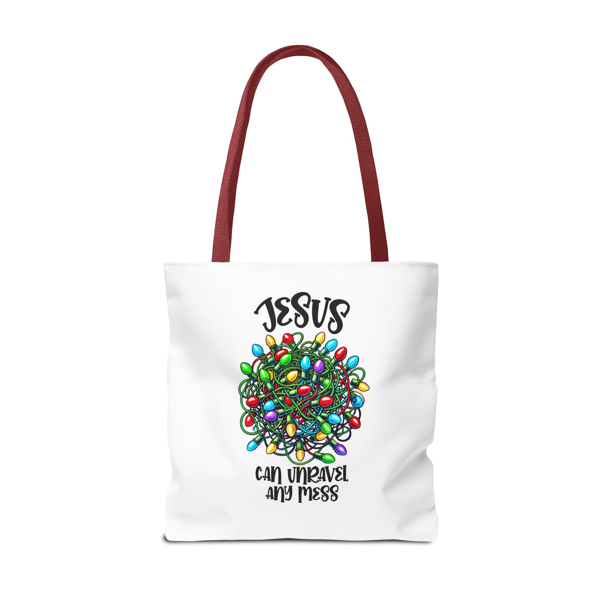 Jesus Can Unravel Any Mess Tote Bag (AOP)